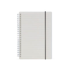 Caderno A5 com capa plástica e elástico para lacre, contém aproximadamente 80 folhas marfim com pauta.