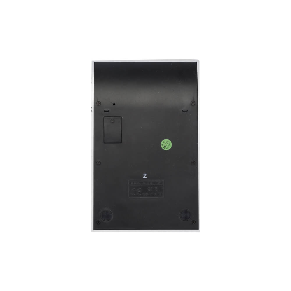 Calculadora plástica prata de 8 dígitos com detalhes preto. Modelo solar, parte inferior preta e com borrachas anti-deslizantes. Acompanha uma bateria L1131.