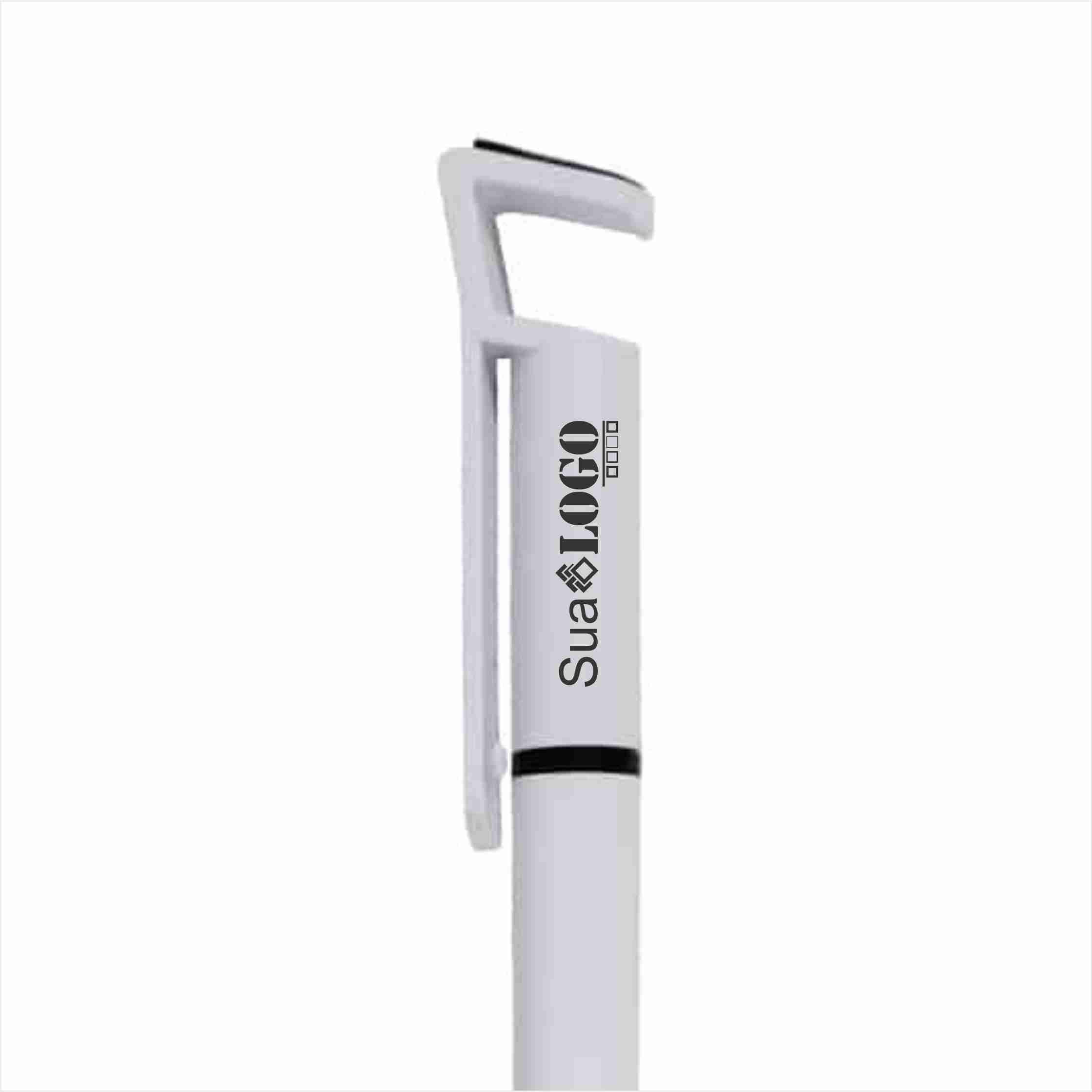 Caneta plástica com suporte para celular, ponteira touch screen e limpador de tela. Carga esferográfica azul 1.0 mm e acionamento por rotação.
