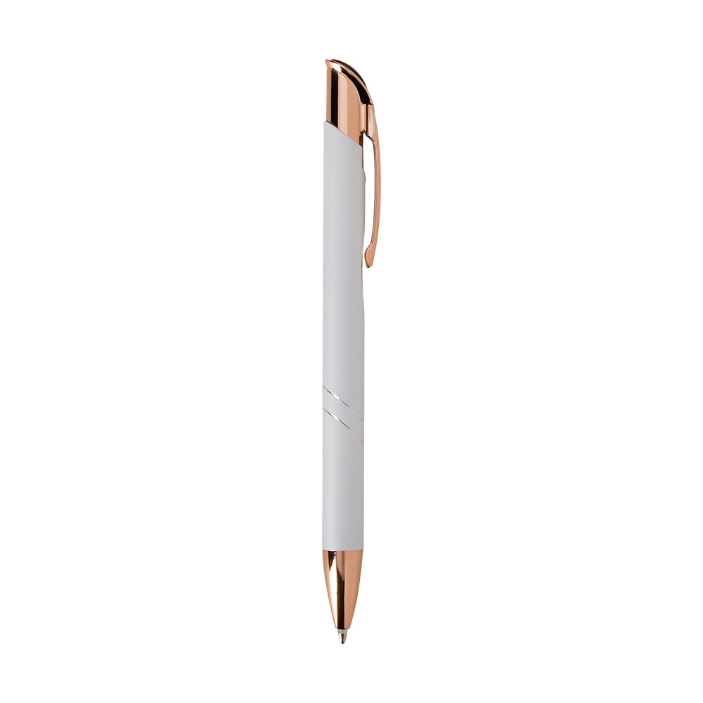 Caneta metálica com detalhes em plástico, acionamento por clique e carga esferográfica azul de 1.0mm, o que proporciona uma pegada leve e uma escrita precisa.