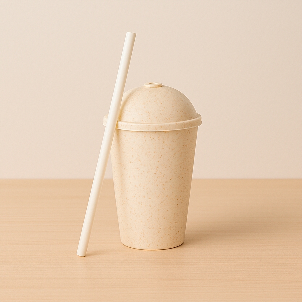 Copo produzido em fibra de madeira com tampa e capacidade de até 450ml. Acompanha canudo plástico para encaixe na tampa.