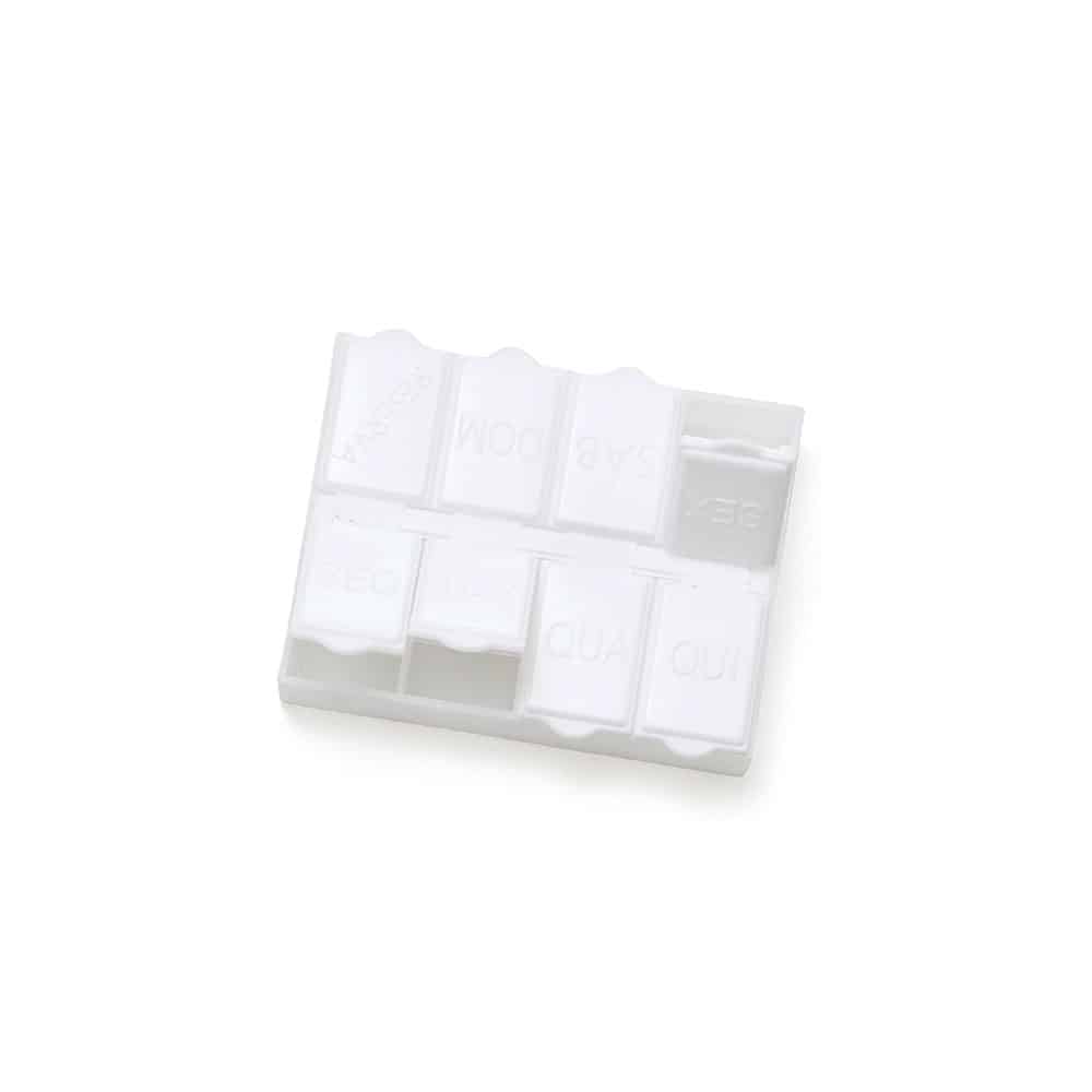 Porta comprimidos semanal de plástico branco fosco. Possui oito divisórias, sete delas escrito em relevo os dias da semana e a última escrito reserva. Verso liso. OBS.: PEDIDO MÍNIMO DE 50 PEÇAS!