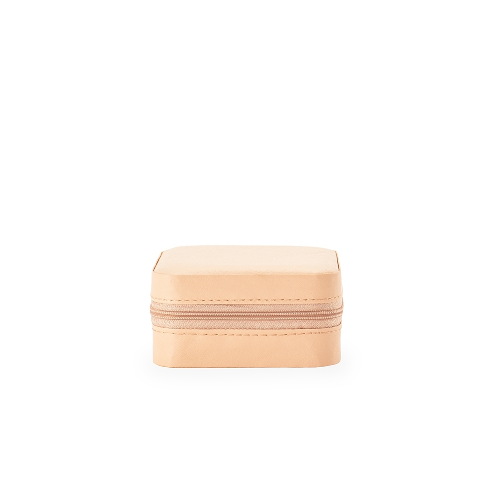 Porta-joias em couro sintético e fechamento em zíper. Conta com revestimento interno em veludo, três ganchos pequenos, um bolso interno e uma divisória com espelho na parte interior da tampa. Possui também compartimento removível com quatro divisórias e almofadas fixas para anéis. Apresenta marcas visíveis de cola no revestimento interno.