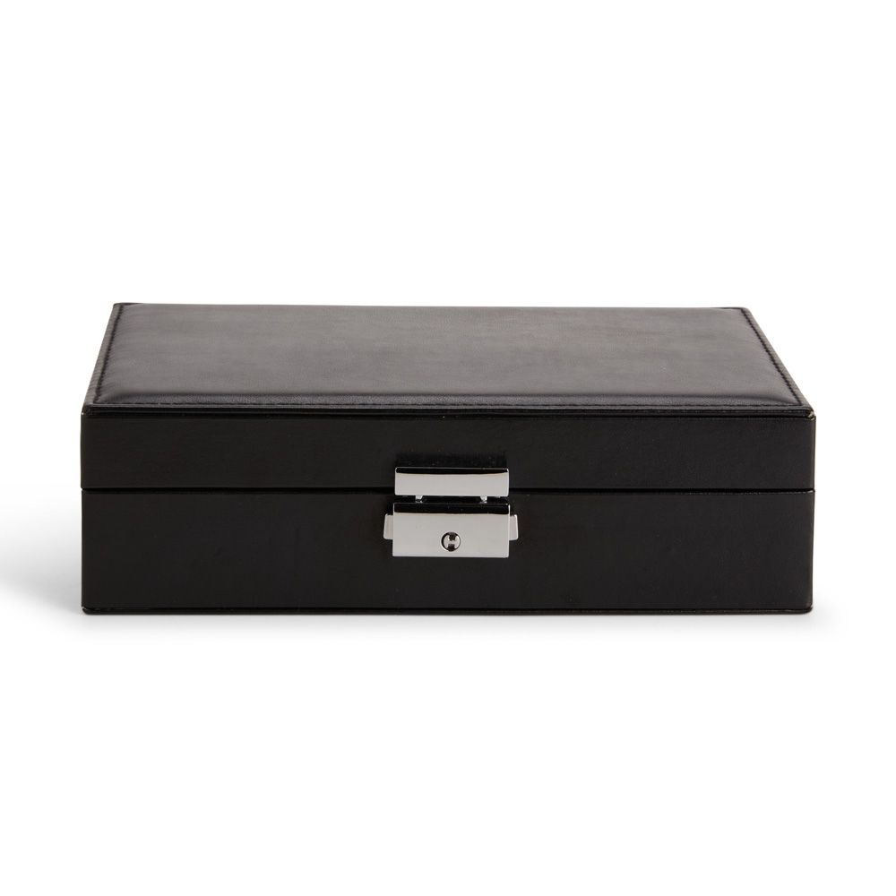 Porta-joias em couro sintético liso, com revestimento interno em veludo e trava de segurança para o fechamento. Apresenta cinco ganchos e um bolso em nylon com elástico na parte interna da tampa, além de nove divisórias em diferentes tamanhos espalhadas pelo compartimento principal, uma delas com almofadas para abrigar anéis e brincos. Acompanha chave para abertura e fechamento do estojo.