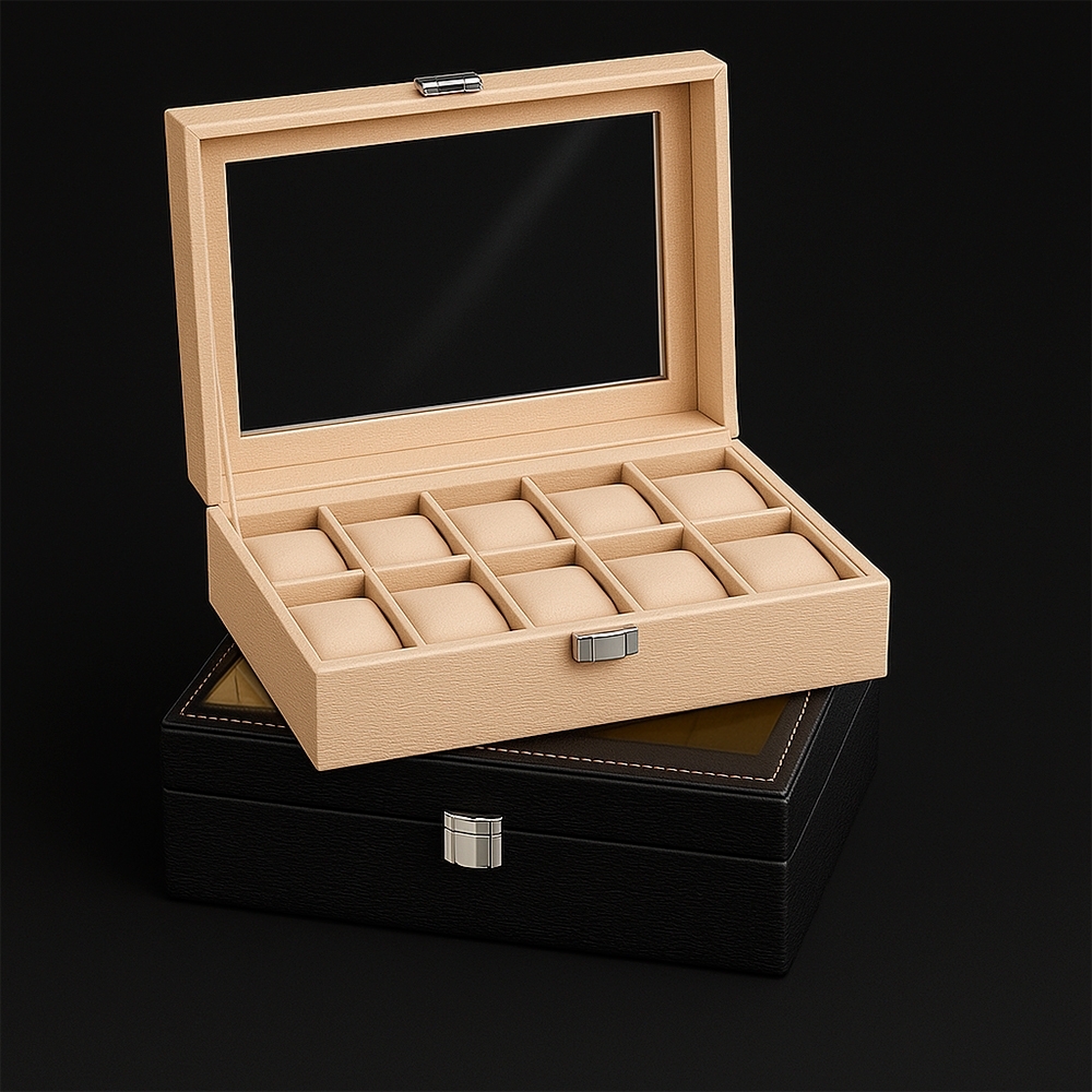 Porta-relógios com acabamento texturizado em couro sintético à base de PVC e revestimento interno em tecido aveludado. Possui dez divisórias com almofadas removíveis, visor de vidro e trava de segurança na tampa.