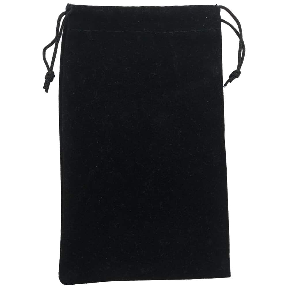 Sacolinha de tecido com textura de veludo, com cordinhas para fechar a parte superior.
